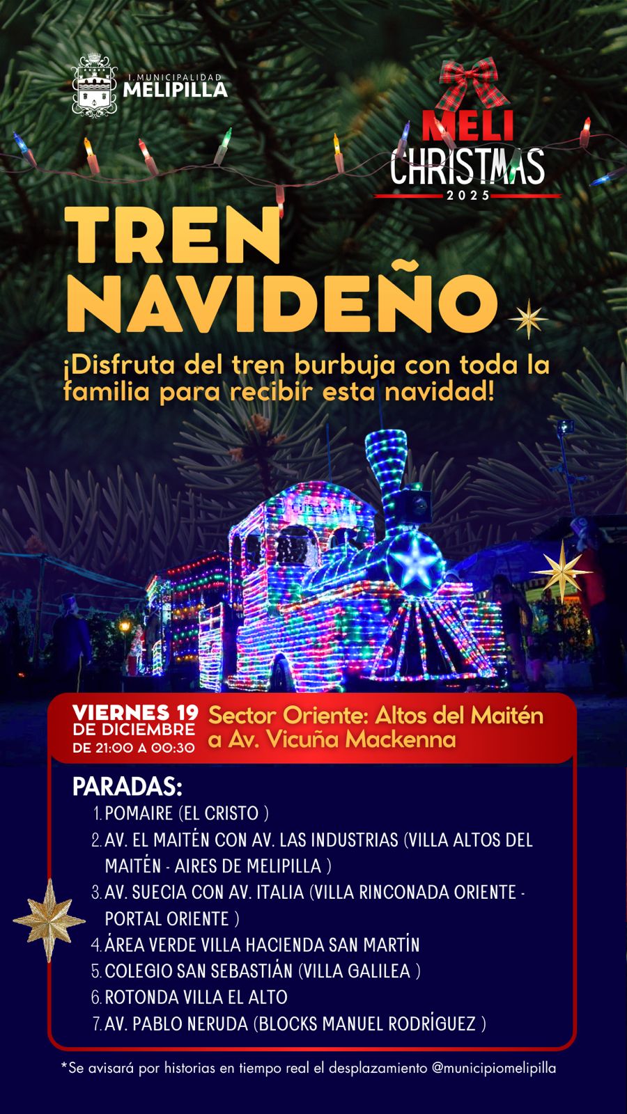 La magia de la Navidad sigue recorriendo los rincones de nuestra comuna. El Tren Navideño, una iniciativa de la Municipalidad de Melipilla, ha llenado de luces, música y sonrisas los distintos barrios durante toda esta semana, con el objetivo de llevar un momento de esparcimiento y felicidad a los niños y niñas de la zona.