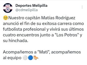 A través de sus redes sociales, Deportes Melipilla confirmó que su capitán, Matías Rodríguez, anunció el término de su exitosa carrera como futbolista profesional.