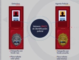 El oficial enfatizó que la identificación se basa en dos elementos que siempre deben ser portados en un conjunto de cuero color burdeo; estos son la placa de servicio y la tarjeta de identificación policial.