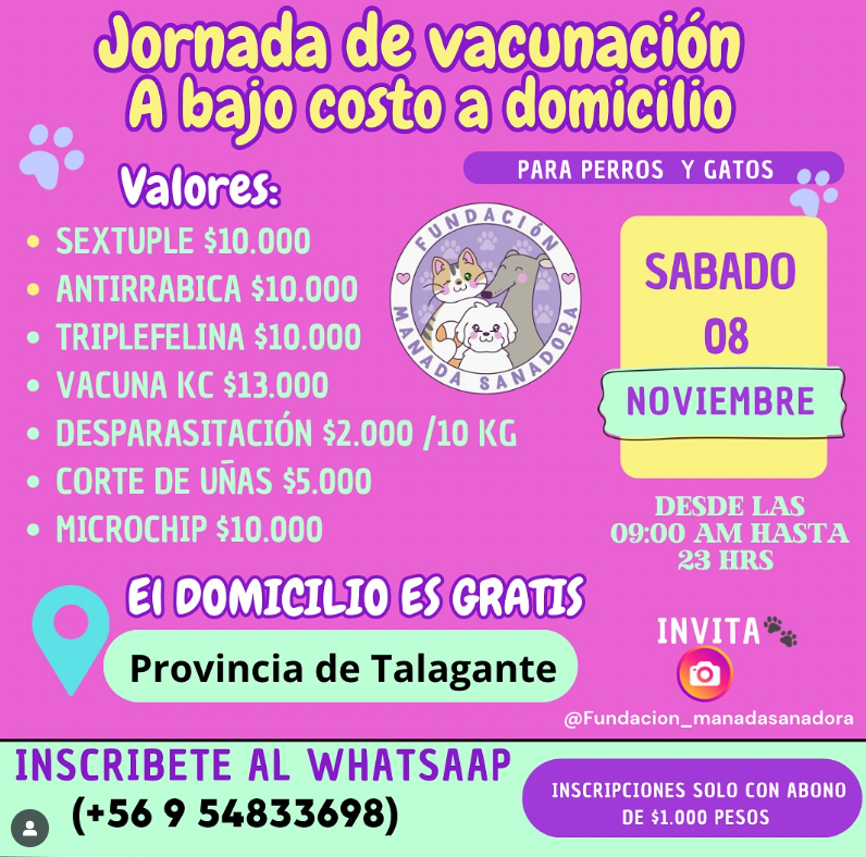 Fundación Manada Sanadora realizará jornada de vacunación a domicilio este fin de semana en la provincia de Talagante 07-Noviembre-2025 EquipoRadioPrensa