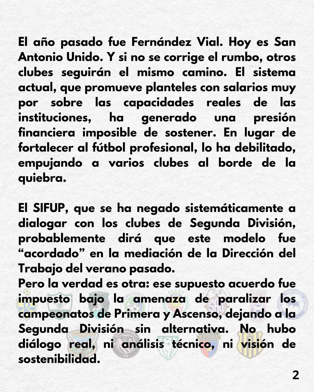 Sostienen que la normativa fue impuesta unilateralmente por el SIFUP, que se habría negado a dialogar y negociar bajo la amenaza de paralizar los campeonatos de Primera División y Ascenso, dejando a la Segunda División sin alternativa.