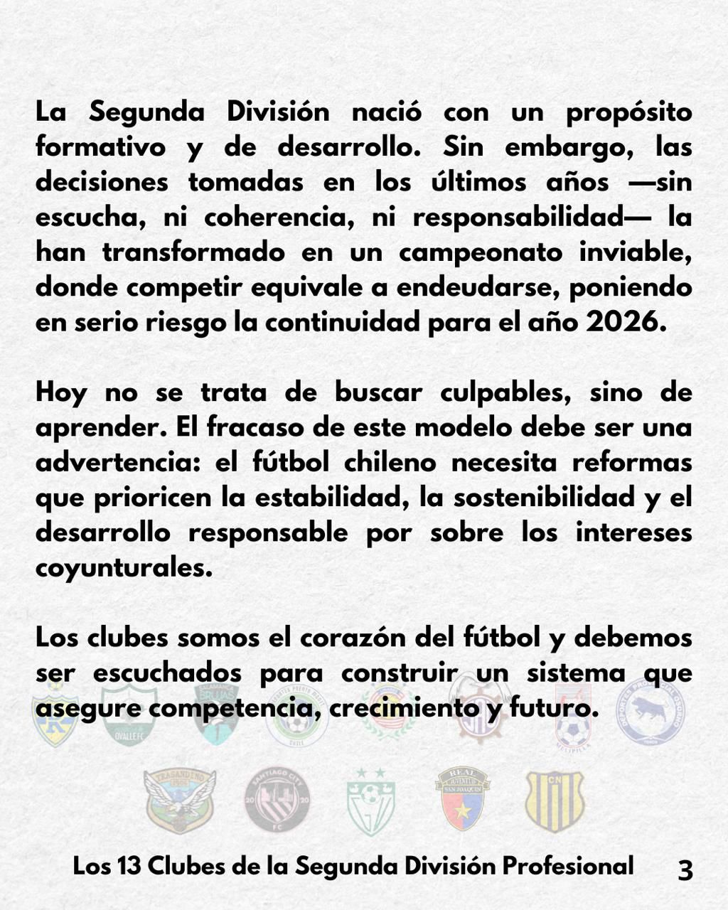 “Hoy competir en la Segunda División equivale a endeudarse, poniendo en serio riesgo la continuidad de la categoría para el año 2026”, señala el comunicado.